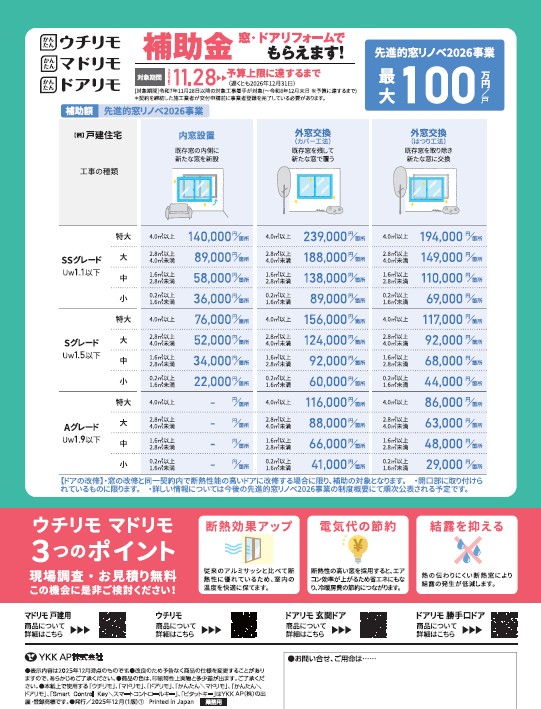 YKK内窓「ウチリモ」販売してます。補助金でお得に導入できます。