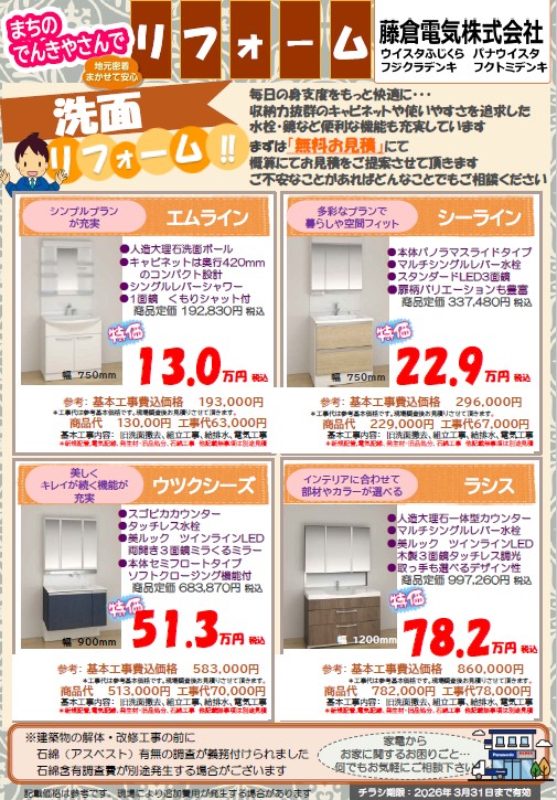 パナソニックの洗面リフォームです。基本工事込みの価格表示です。パナソニックの特徴は有機素材です。お手入れしやすい、安定の品質です。