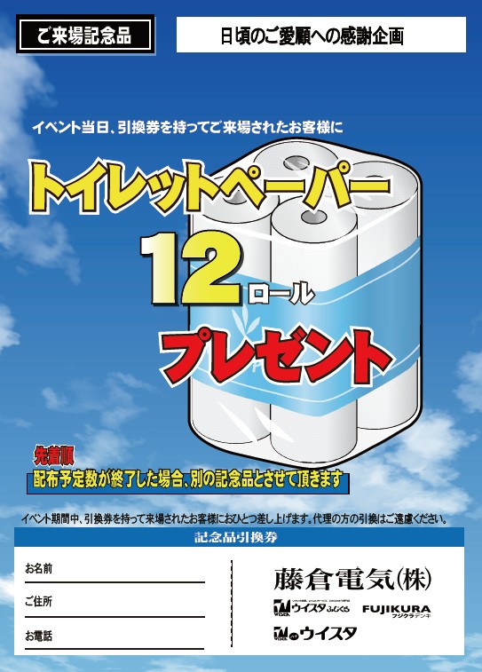 ご来場のお客様にトイレットペーパー12ロールおひとつプレゼント!毎年恒例の記念品です。ウイスタ来場記念品で常に上位の人気!